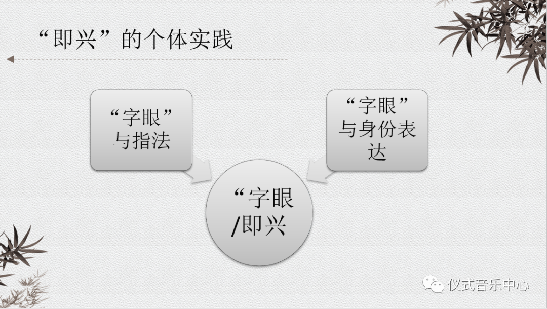 《江南丝竹“即兴”演奏研究》这篇论文主要由此四个部分构成。在第三部分认为“板位”是江南丝竹“即兴”的根基,而“字眼”是他们“即兴”的外现。她从“字眼”与身份表达、“字眼”与指法两方面对“即兴”的个体实践进行了探讨。