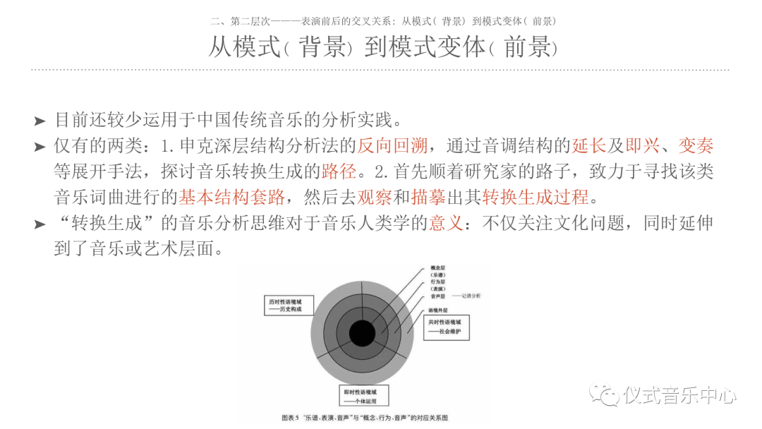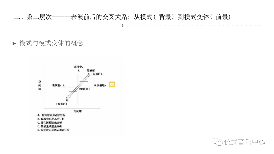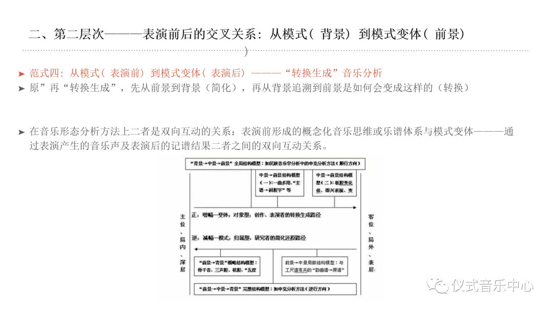 接下来是表演研究的第二个层次,即“表演前后的交叉关系:从模式(背景)到模式变体(前景)”。如下方PPT中所示,该类研究穿梭往返于“表演前、表演后”。