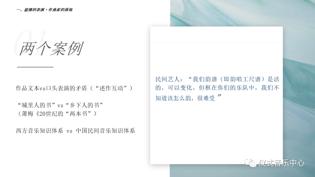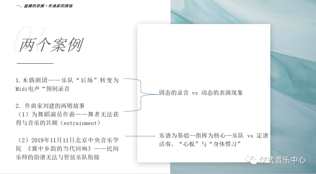 作者在这里通过两个例子来讲述,在第一个例子中,木偶剧团将伴奏乐班换成了Midi电声的预制录音,而失去了民间表演中互动、即兴创造和临场发挥的特点。在第二个例子中,作曲家刘健在与舞蹈家合作,在举办一场管弦乐队和民间艺人合作的音乐会中,都出现了无法配合,无法衔接,无法调和的问题。通过这两个例子,作者总结前两者是固态的录音和动态的表演现象的冲突,后者是乐谱为基础—指挥为核心的乐队与习惯定谱活奏、“心板”与“身体惯习”的民间艺人的冲突。