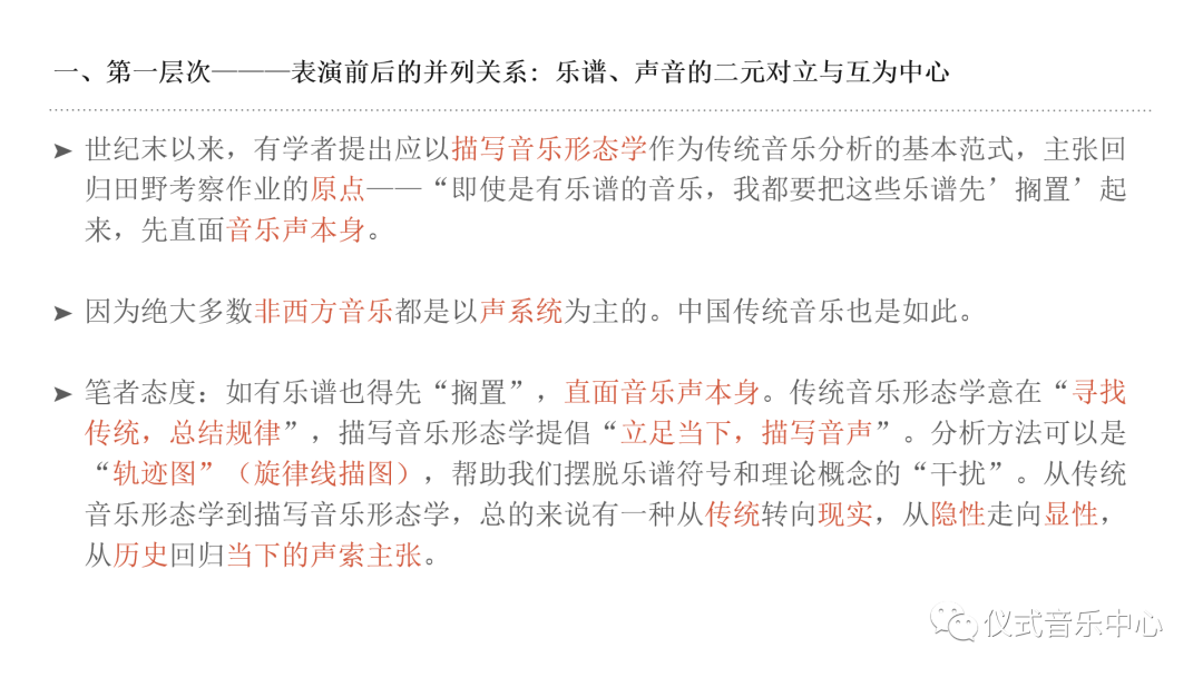 描写音乐形态学要求我们“搁置”乐谱,直面音乐/声本身,因为绝大多数非西方音乐都是以声系统为主的,中国传统音乐也是如此。