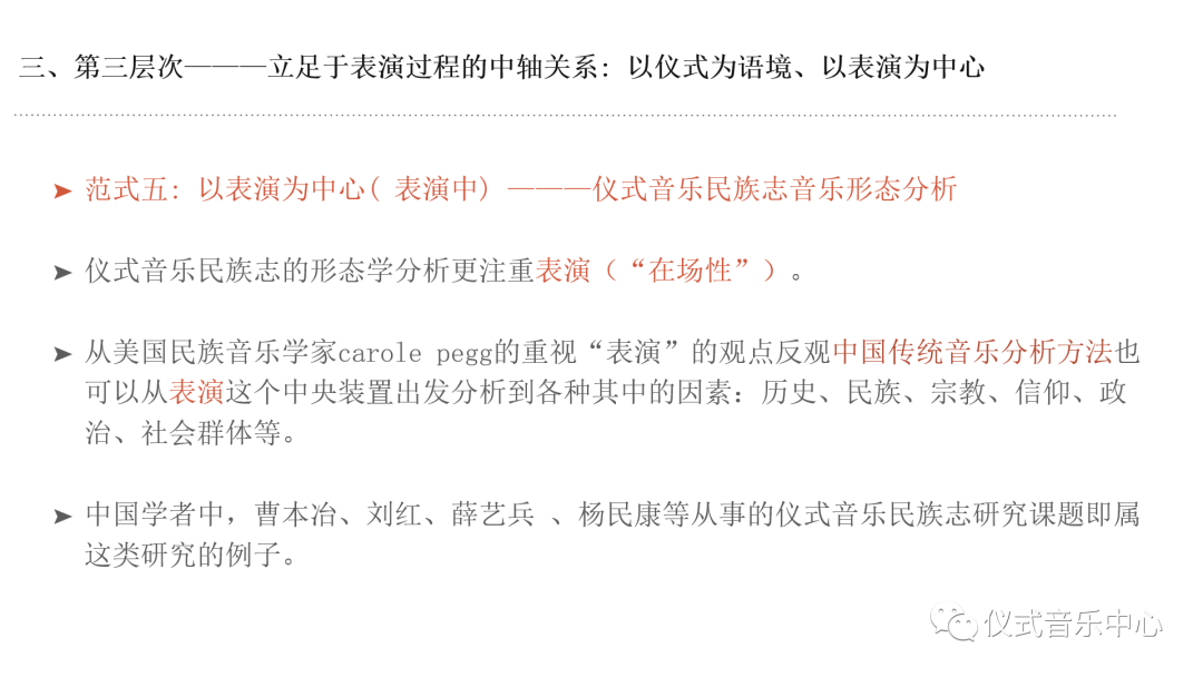 之后,作者提到了研究的第个三层次,即以仪式音乐为语境,也就是以表演为中心的音乐分析方法。作者表示仪式音乐民族志的形态学分析更注重表演(“在场性”)。他从美国民族音乐学家Carole Pegg的重视“表演”的观点反观中国传统音乐分析方法也可以从表演这个中央装置出发分析到各种其中的因素,比如历史、民族、宗教、信仰、政治、社会群体等。