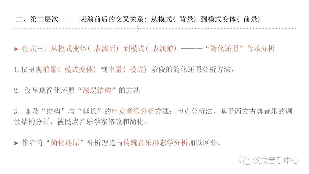 作者在这一部分提出了第三种研究范式,即“简化还原”音乐分析。其中比较重要的是申克分析法,它基于西方古典音乐的调性结构分析,后来被应用于民族音乐学分析,为了适应新的学术环境和研究条件的需求,民族音乐学家对其进行了必要的修改和简化。这类研究范式注重实证分析,从音声开始,按程序走完“前景—中景—背景”的“简化还原”的全程。