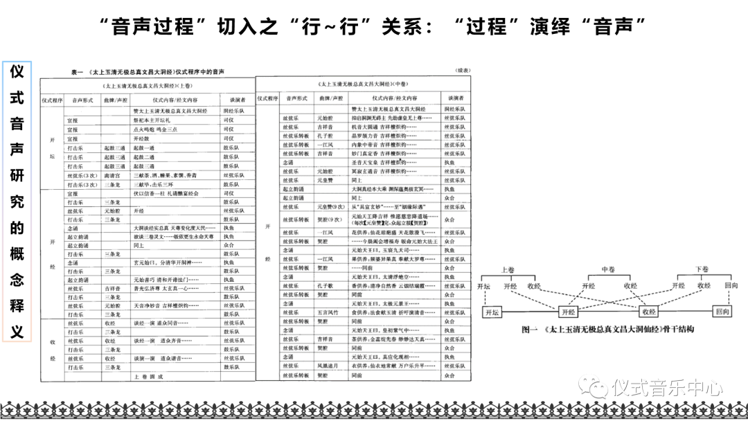 3.仪式展现(过程)〜仪式音声(产品)——这对概念表示了“仪式程式”在科仪过程中展演“音声行为”的运行关系。