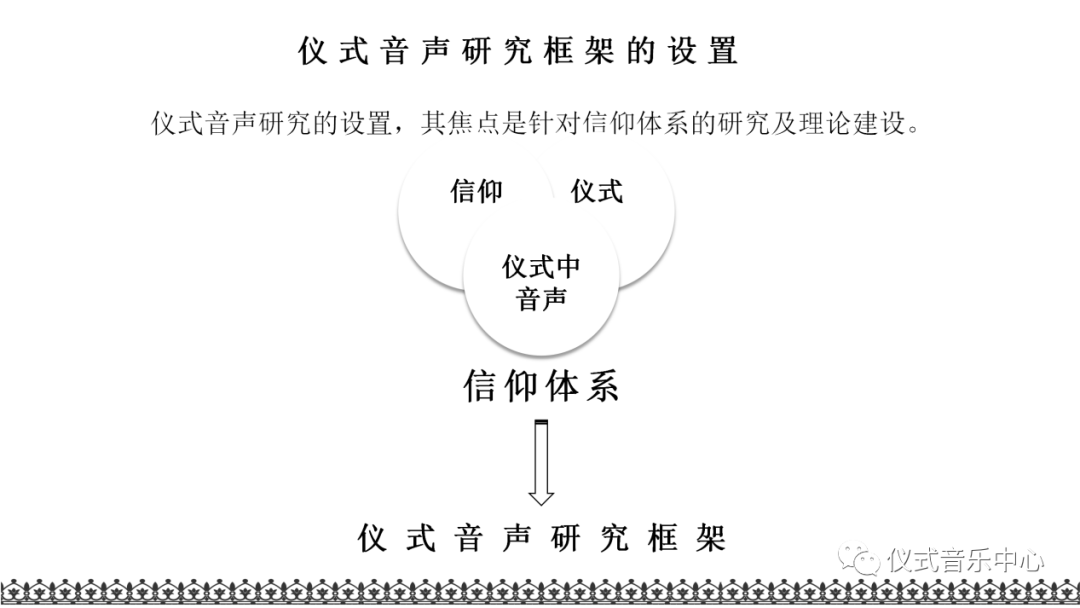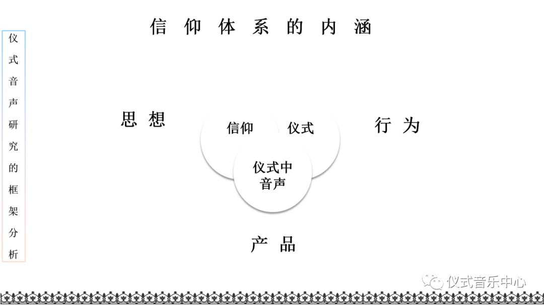 下面是汇报的第二部分内容——仪式音声研究的框架分析。我们根据阅读得知,正是基于仪式音声研究的思维,作者提出了适应于该研究的框架。该框架的设置,其焦点是针对信仰体系的研究及理论建设。