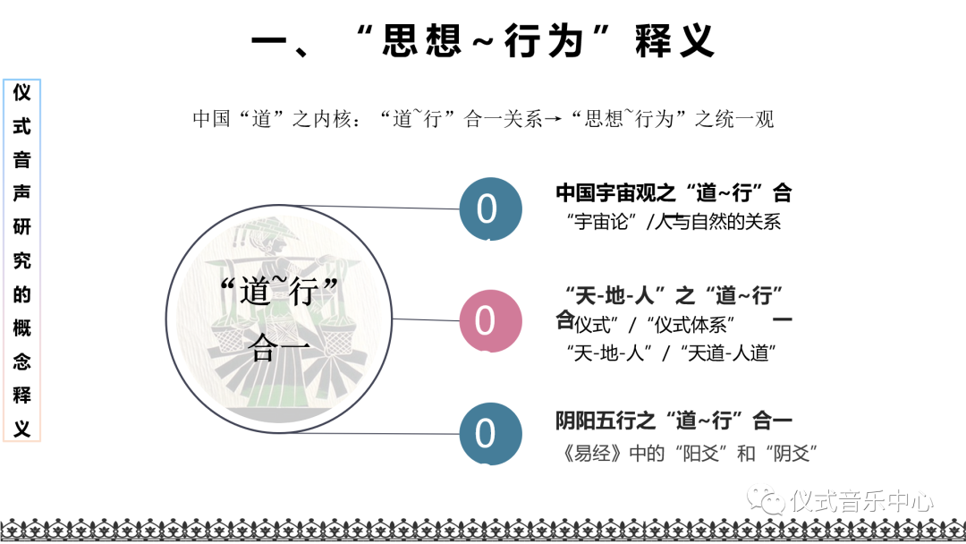 在第一部分思想行为释义中,作者想要表明的是,这种理论或者分析模式的提出,来自于中国传统思维中的“道”和东西方思维中共有的“行为”概念。思想~行为的核心就是,以“行”之外象觉悟“道”之内核,即通过仪式中怎么做来思考每一个参与仪式音乐中的人怎么想。