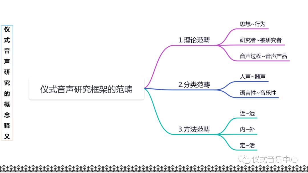 根据之前内容,仪式音声研究框架主要涉及三个范畴:理论范畴、分类范畴、方法范畴。