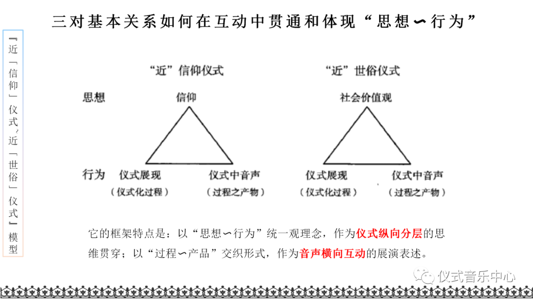 为了进一步阐释这三对基本关系是如何在互动中贯通和体现“思想〜行为”,作者为我们列出了以下图示,它的框架特点是以“思想〜行为”为统一理念,作为仪式纵向分层的思维贯穿;以“过程〜产品”交织形式,作为音声横向互动的展演表述。
