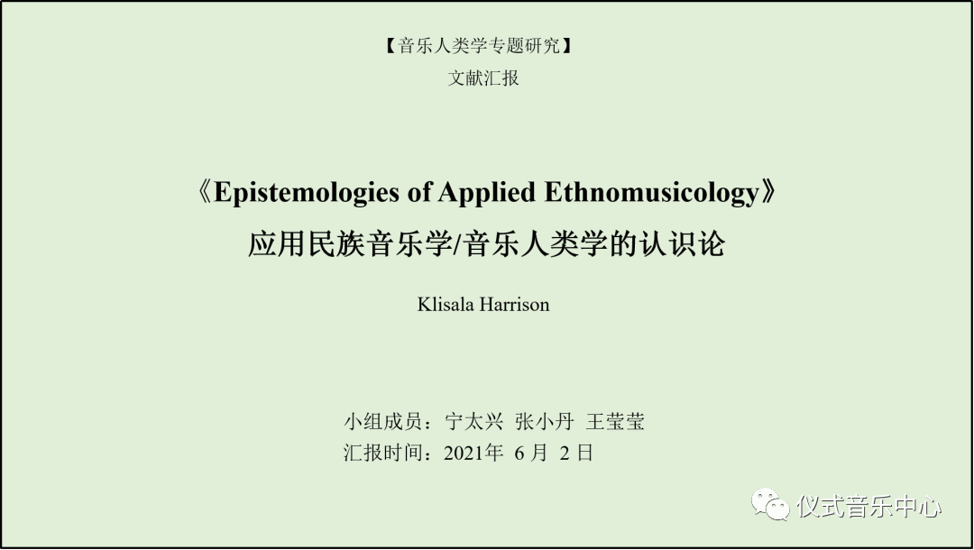 课程第一部分,有两组同学分别就张伯瑜《何为应用民族音乐学?》【1】和Klisala Harrison“Epistemologies of Applied Ethnomusicology”【2】(《应用音乐人类学的认识论》)两篇文章做了阅读报告。