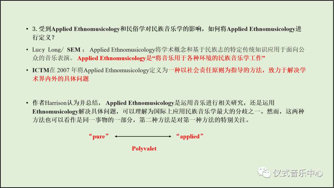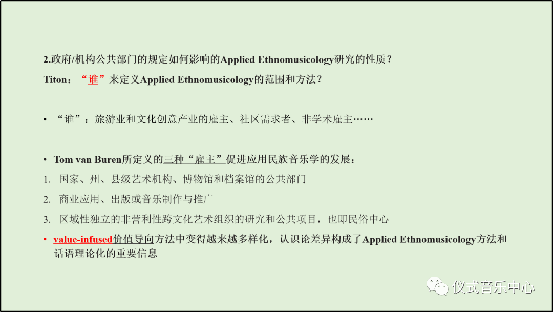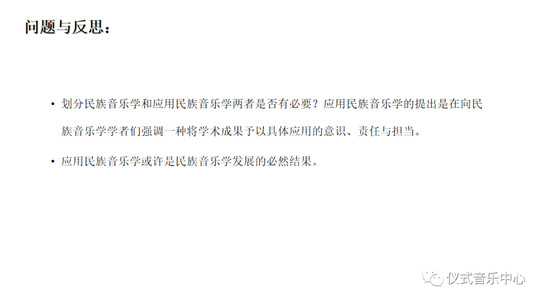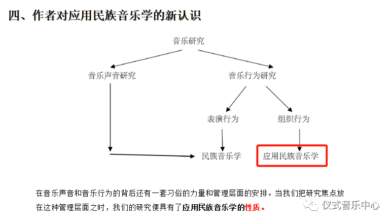 张伯瑜在论文最后,从研究对象的角度来区分音乐人类学和应用民族音乐学,他认为音乐人类学关注音乐创作与表演的音乐制作过程,关注音乐声音与表演行为之间的关系;而一场音乐会的演出,除了表演者在舞台上的表演行为之外,背后还有围绕这场音乐会的一系列组织行为,并且这些组织行为对音乐表演的意义、价值与结果产生重要影响,所以如果将音乐表演背后的组织行为作为研究对象,将研究焦点放在管理层面之时,研究便具有了应用民族音乐学的性质。张毅小组在此提醒大家注意作者使用的“性质”一词,他们认为作者并没有绝对的说应用民族音乐学就是研究音乐活动背后的组织行为,而是说研究音乐活动背后的组织行为具有应用民族音乐学的研究性质,也就是说研究音乐活动的组织行为只是应用民族音乐学研究中的一部分,正如前文提到当前应用民族音乐学的学科定义、研究方向等方面都还不太清楚,不同学者对此都有不同的认识。另外,作者同样认为音乐人类学和应用民族音乐学之间的关系十分模糊,我们无法以理论价值和实用价值作为划分两者的因素,因为这些问题都是相对而言的,例如文中提到的数据库,它的建设对于民族音乐学家而言是理论性的,而面对广大民众时,数据库是实用性的。