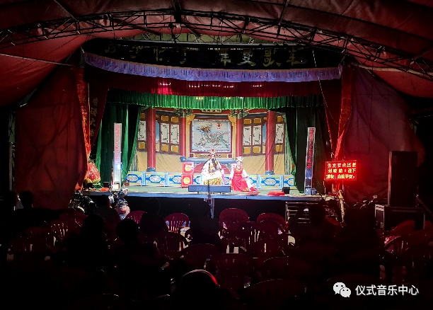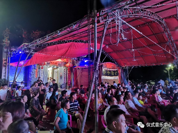 当天晚上七点四十五分,我们到达陆丰市潭西镇后埔村,村里没有固定戏台,金艺白字戏剧团演出的戏台临时搭建在村子的广场上。戏台前便是看棚,看棚上方悬挂着一条横幅,上面写着“姑婆腾云升天扶持千业振”几个大字,我问县剧团的打击乐手卓家好“姑婆”是谁,他说:“姑婆就是一辈子都没有嫁出去的女人呀,是这个村子以前的老祖先,今天就是庆祝姑婆的诞辰,所以请人来演戏呀”。