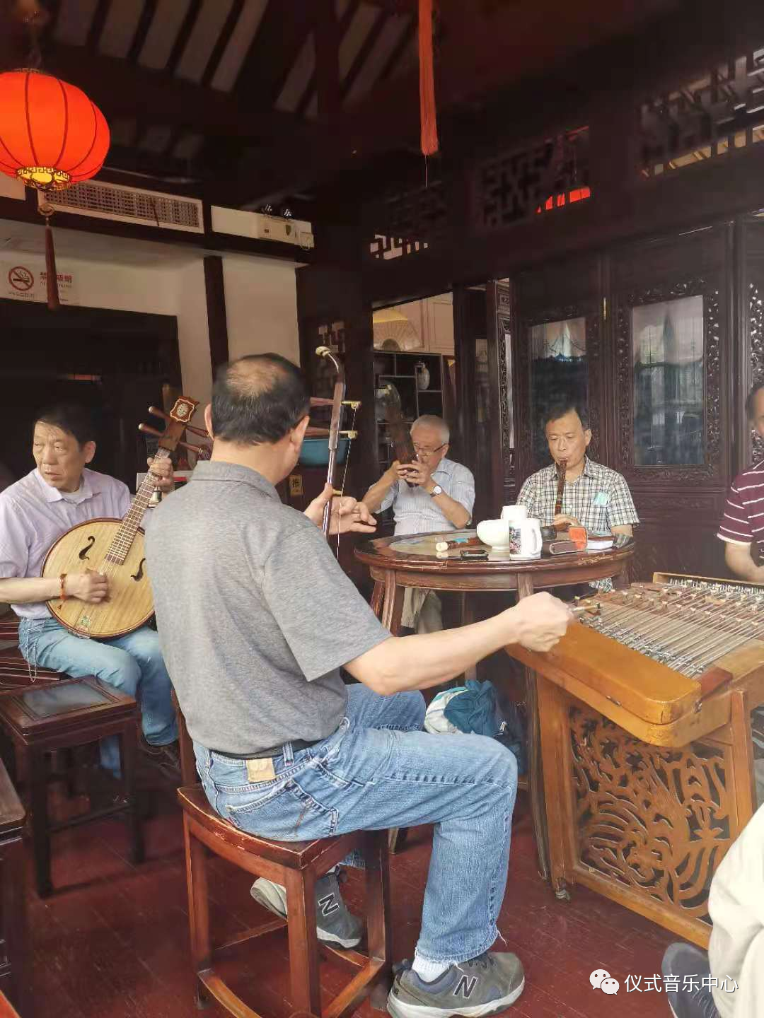 放在桌上的乐器是共享的,专门有人负责带乐器,几乎每一位老先生都会几样不同的乐器,他们很乐意用不同的乐器和不同的人组合演奏不同的曲目,在别人演奏时其余没有演奏的人会在一旁的桌边喝茶聊天,有意思的是他们互相的关系非常和谐,有时会半开玩笑地评价某位乐手的演奏。使我非常感动的是我第一次去他们就邀请我和他们一起合奏,即使我看着手机存储的乐谱而无暇和他们眼神交流,他们也始终会点头和用眼神对我进行提示和呼应。