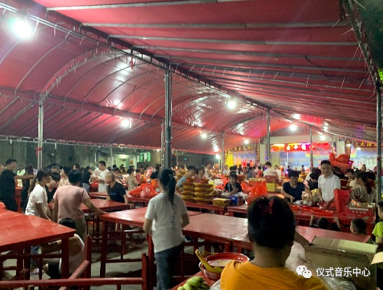 但当天傍晚,天色渐暗,村民们便从四面八方聚集而来,与下午形成鲜明对比,广场上一下子热闹了起来。村民们陆续架起上百张红色八仙桌,各家各户将家中的食物、供品由扁担挑来,将它们摆放在桌上,为这些物品“开光”,沾沾喜气。戏台前的观众也逐渐多了起来,一些老人及妇女将家中的板凳搬来,其余青壮年则在人群中插空观看。在夜戏上演的过程中,村民们陆续依次到神棚前上香、祭拜后,便会来到戏台前驻足观戏。