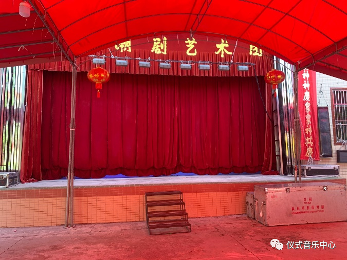 与过往不同,丘卡村有专属的戏台建筑,坐落在村子正中央广阔的广场上,演出前只需要由专业的搭台人员按照潮剧演出的舞台规模,安置好幕布、灯光、布景即可,不需要再用竹竿、铁架、木板、油布搭建一个临时的戏台。甚至乎,丘卡村的戏台还用上了LED屏作为背景,不用工作人员在幕间紧急抢景。当我惊讶于现在下乡演戏还有这么高级的舞台布置时,团长淡淡地说:“十年前就有啦,只不过不常用,以前像这样的LED背景差不多要30万,现在10万就能搞定”。