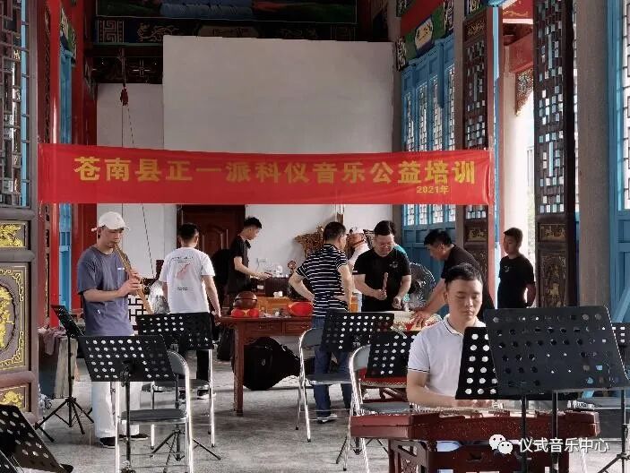 在阿东老师(肖日东,苍南道教音乐省级传承人)的带领下,几个年轻的当地禠公在玉音乐团的传承基地排练苍南道教音乐的传统曲目《炉焚柏子》和《文辞》。不过排练时整齐划一的道教音乐与苍南民间斋醮科仪中灵活运用的仪式用乐显然不同。