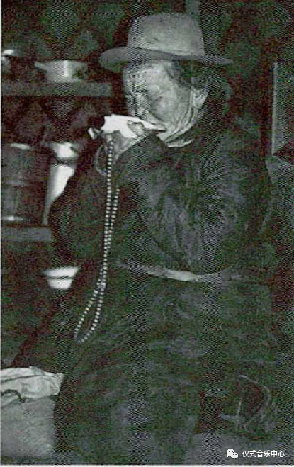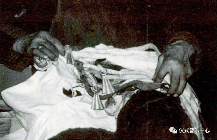 朝鲁和甘陶格套呼曾解释过布里亚特萨满的乐器、音乐和舞蹈的选择与不同神灵(翁衮) 之间的关系:杖和鼓用来请黑神(haryn duudlaga),口弦用来请白神,有些请神会将翁衮请进自己的手杖(布里亚特语称hor’bo)或铃铛。据他们说,有位布里亚特萨满是先用杖再用鼓。手杖上缀有铃铛和金属响器(holbogo),晃动时会发出声响(图2)。男女萨满请神时,先一边前后摇晃手杖一边歌唱,感觉到神灵靠近时便吹气发出风声,接着边旋转跳跃边击鼓,请来的神不止一位。布里亚特萨满有一个习惯,每提高一个等级都要在头饰上增加一个角。有一张1977年拍摄的布里亚特萨满照片,其中的头饰有八个角,表明这位萨满已经达到了八级。在九级之后,萨满会获得杰仁头衔。