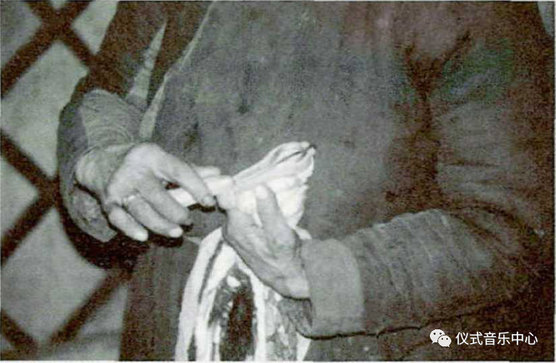口弦是达尔哈特萨满刚入行时演奏的乐器(迪奥齐兹,1963:56),有三种演奏方式:节奏性的“直弹”(shuud tsohilt),象征着行路;“舌弹”(helnii tsohilt)以舌头来回颤动改变音高来模仿动物哭泣,与动物神交流;“神弹”(ongodyn tsohilt)模仿的是动物慢跑,在神灵离开萨满身体回家或是回到栖息的山河时弹奏(尼克松,1984:52)。达尔哈特女萨满那德米德还保留着她的口弦,平时放在一个木盒子里,做仪式时系在用来请神的短鞭上(图1)。