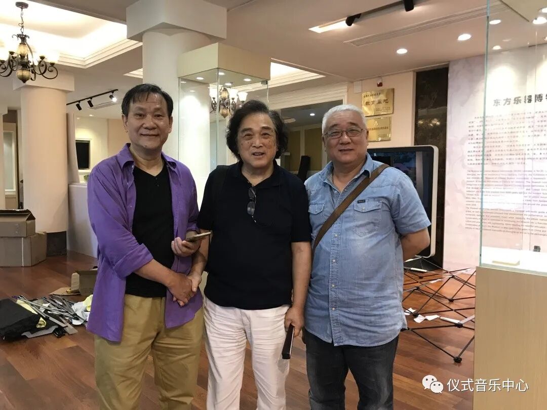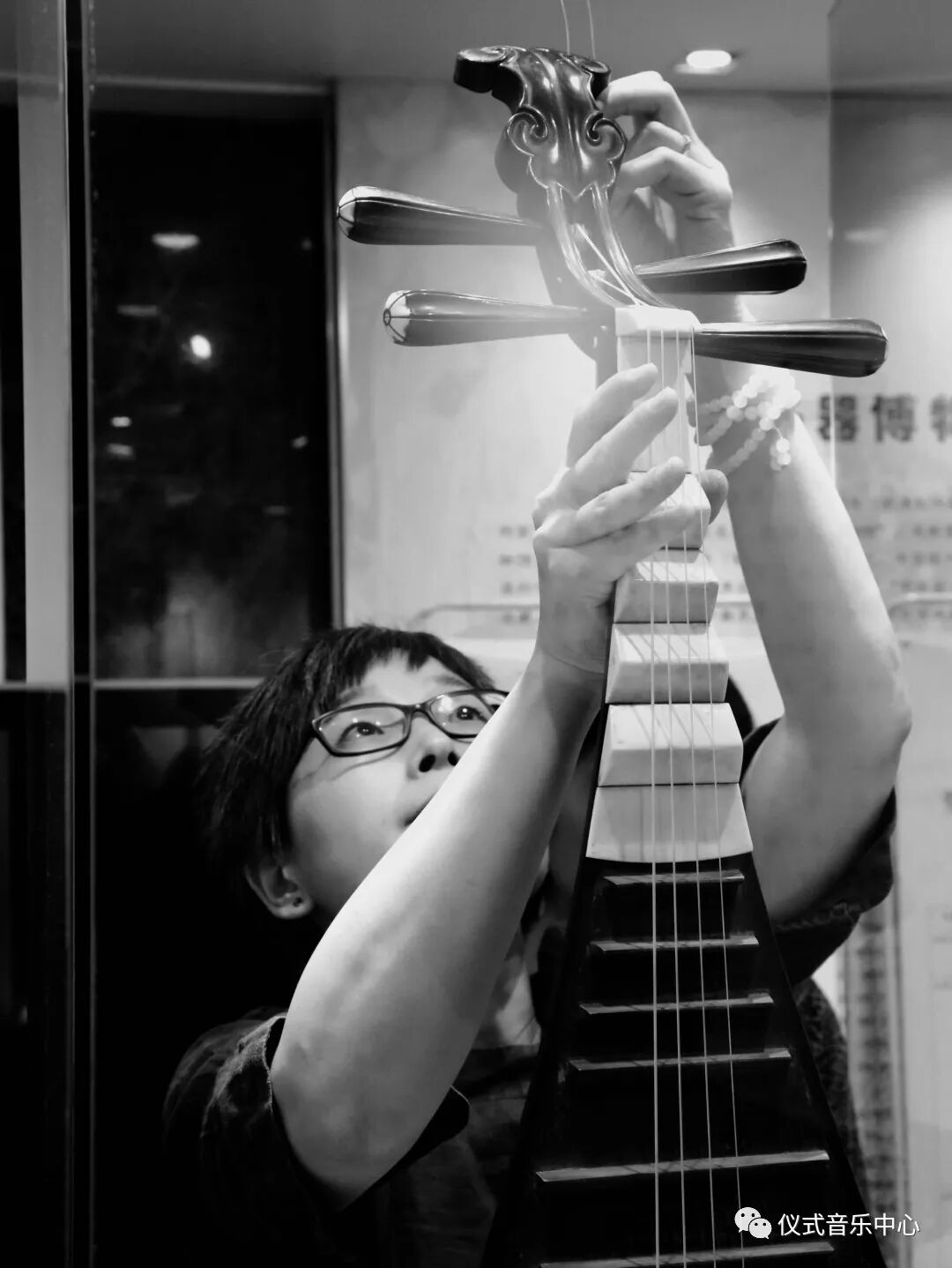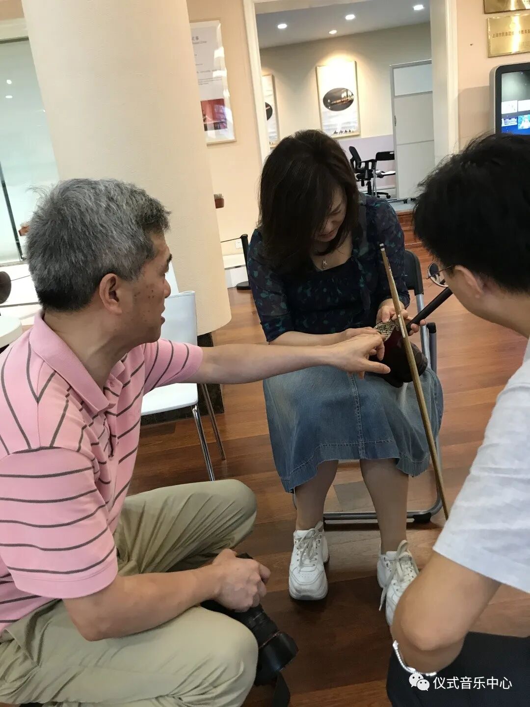 图右:陈春园老师(中)为演奏许光毅使用的二胡做准备