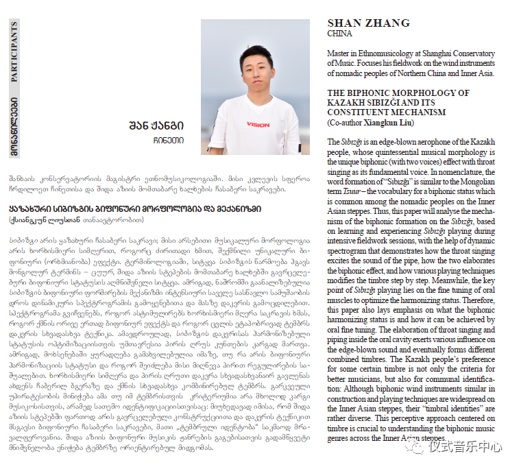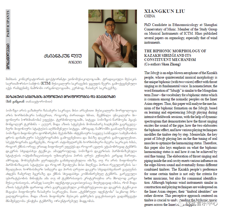 上海音乐学院音乐人类学硕士研究生张珊和博士研究生刘祥焜(导师萧梅)合作完成了题为《哈萨克乐器斯布斯额的双声形态及其构成机理》的汇报,内容从斯布斯额的术语阐释与乐器形制、认知核心与演奏方式、声音感的多重认知三方面展开。