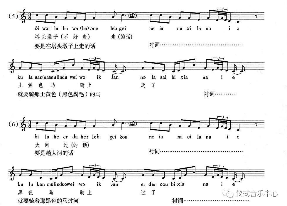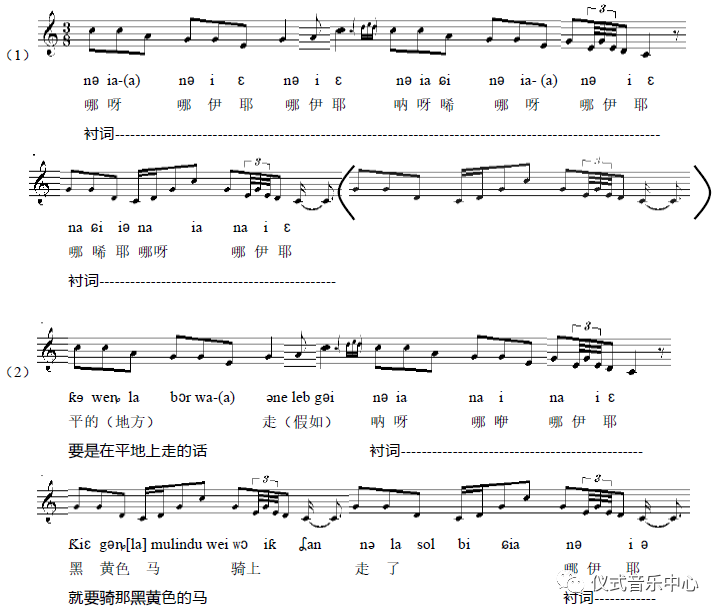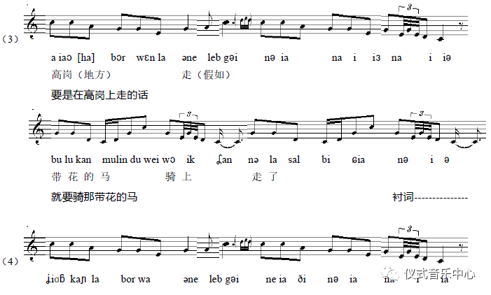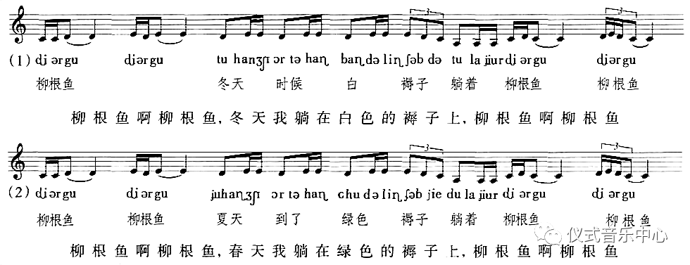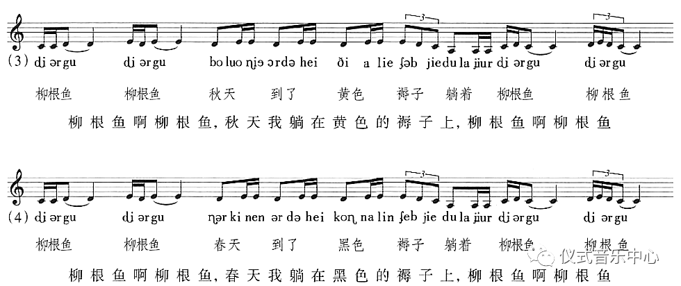 这样,原本歌唱中的一句(也可以看作是“一个声音”)便被一个“声音”(与柳根鱼发音相似的“ɖiligəɲ”【嘀哩艮】)所包围起来,因此,我们也可以理解为,这里是用“声音”呼唤了“声音”。