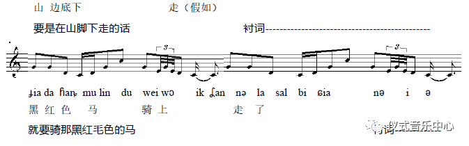 笔者曾在新生乡从70多岁的鄂伦春人吴卡尔康·福红那里采录到一首被称作《过什么地方走什么马》(见谱例1)的歌曲,根据当时采录的情形,我判断这首歌具有很强的即兴特征,且从歌曲的建构法则而言,亦体现出丰富的“音韵关联”[9]的特性。同时,当沿着由“音韵关联”所构成语词进一步分析,有可能透过表层的“关联”发现到属于鄂伦春人内在思维的结构原则。
