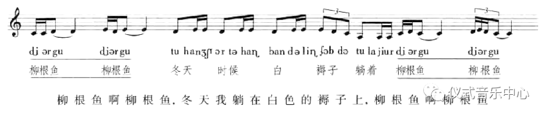 这首歌中,溺水的小孩的歌要唱给“柳根鱼”听,而“小孩”歌唱的每一段,其前后的歌词均为“柳根鱼柳根鱼”,即[ȡi ər gu]【滴尔故】,构成了一个由“柳根鱼”所包含的乐句,即: