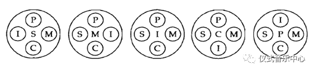 直至晚年,C.Seeger以“想象”的对话形式,完成了他“音乐学统一场论”的漫长写作。他以每个人都具备的对于其身处的世间世外反映出的高度概念化的“世界观”来界定和系统化这个统一场。并强调这个世界观如同一个复杂的经验实体构成的“结构性领域”(structual universe),并且是“真实”的知识。他为音乐学的结构性领域设定了五个子域,即用S(speech)代表话语或言说(包含情感表达、理性逻辑、日常话语三种模式);用M(Music)代表音乐(人通过声音媒介交流某些不能说的事情);用I(individual)代表经验域中的个人;用C(culture)代表文化(为音乐的可能性提供基本框架的社会组织和传统);用P(physical)代表自然、现象的外部世界(事实和科学的领域)。这五个子域建立了C.Seege对音乐学的全面界说。即:音乐学是(1)用语言进行的研究,既是系统的和历史的,也是批评的和科学或科学化的;(2)它是人类的总体音乐,既是音乐自身,也相关音乐范围以外的东西;(3)通过学生个人的培养,使他们认识到这个场域既是音乐家也是那些以音乐的某些方面为资料、并以理解人为目的的非音乐专家们创造的,并且都是(4)人类文化的和(5)相关着自然世界的关系总体。其中每一个子域都可包含其它的几个,并且子域之间不分主次,各可为主,又因不同主次的解释改变音乐学结构领域的地貌(1977:108-109)。(见图一)