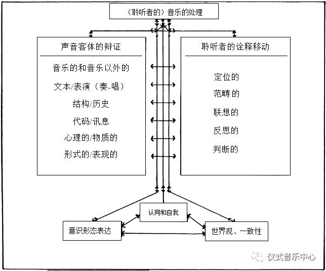Feld提出“诠释的移动”,正是由C.Seeger的问题出发,并如其论文的标题《交流,音乐,及言说音乐》所示,他将言语之“说”从交流的角度,明确其为社会活动中进行的意义解释过程。文章多处穿插着与Seeger的对话,并以“交流的取向”、“交流与指号过程”、“辩证的音乐交流”、“进入聆听:从辩证到诠释”、“从诠释的移动到边界和框架”、“言说音乐”以及结论等部分构成(1984:1-18)。文章的重点强调交流过程首先是在社会的、交互行为的和主体间性领域发生的,是一种嵌入了社会文化的过程的,并通过符号形式的诠释,呈现出产品(音乐作品)的符码及其意向与其接受者的讯息处理和诠释的复杂关联的,由社会成员的主体体验所进行的想象的重要活动。从这些观点中,我们可以看到他延续自己在1970年代对于民族音乐学中运用的某些语言学模式的批评,即完全地反对自律和抽象的音乐分析 。因此,他强调自己关注的不是逻辑的或中立的分析,而重在音乐意义的交流过程与诠释。正是在这个前提下,他将讨论转移到活生生的聆听基础上,这种聆听,不是对乐谱、作曲家或符码本质的破解和探讨,而是音乐意义的建构;且他强调聆听者的社会历史处境,在对音乐意义的建构上,是以自己的社会经验、聆听经验、包括背景、能力和欲望等等来处理音响(sounding)的符号特性的,而绝非仅仅按照“格式塔”原则处理音响刺激的器官或机体。“诠释的移动”,一方面以音响客体在交流过程中展现出的音乐和音乐范围以外的、文本与演奏的、结构和历史的、符码和讯息的、心理与物质的、形式与表现的对应,展现一种辩证的张力;一方面以聆听者在诠释中不断以自己的能力,在社会生活和生命经验中通过自身已有的听觉经验来对所听定位(locational)、对于所听的感性经验范畴归类(categorical)、以及展开同时性的聆听联想(associational)、并反思(reflective)和判断(evaluative),由此构成交流过程的两个核心成分,并呈现出一个建模系统。(如图二,ibid,9)