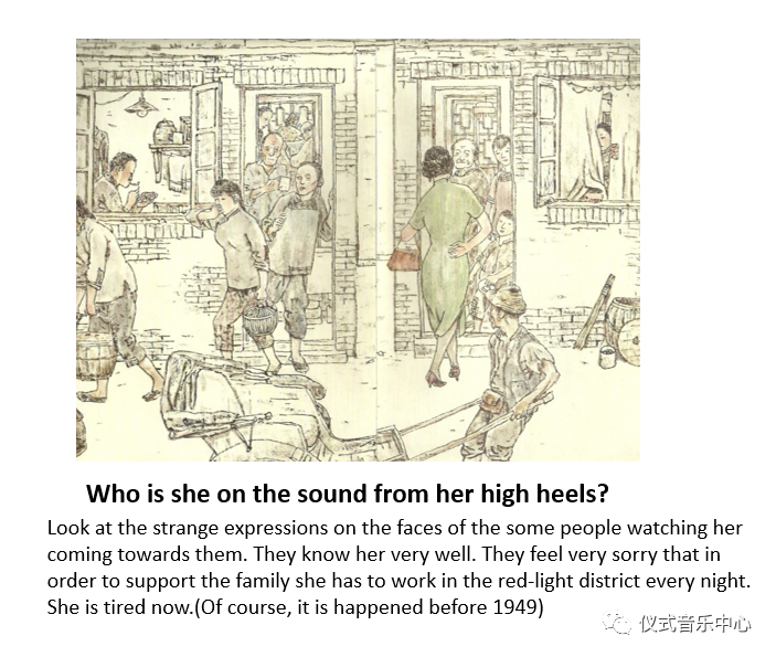 4.Look at the strange expressions on the faces of the other people watching her coming towards them. They know her very well. They feel very sorry that in order to support the family she has to work in the red-light district every night. She is tired now. (do youhearedher heel’s sound?)