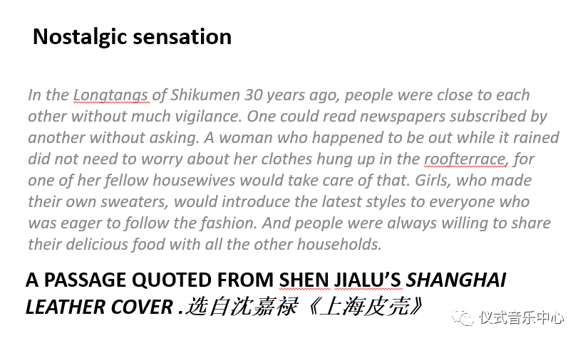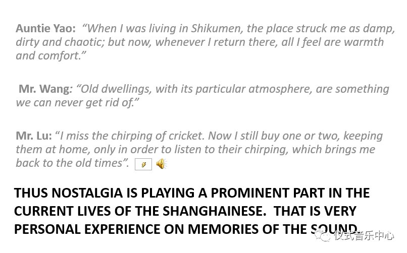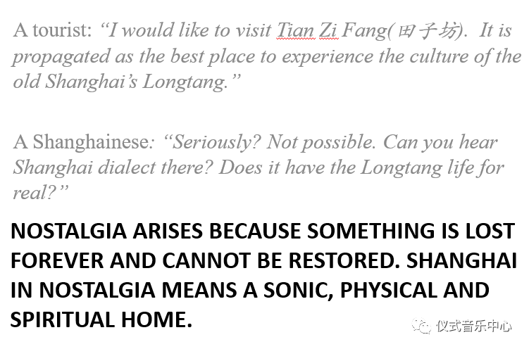 Thusnostalgia is playing a prominent part in the current lives of the Shanghainese. Thatisvery personal experienceonmemories of the sound.
