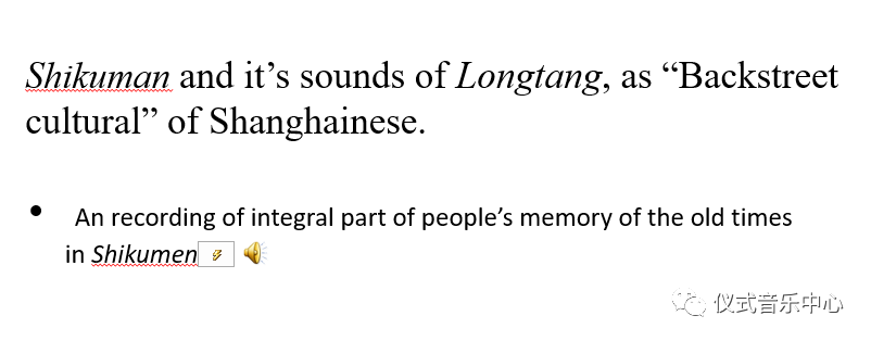 Shikuman and it’s sounds of Longtang, as “Backstreet cultural”ofShanghainese. I’d like to play a mixed recordingtoyou: