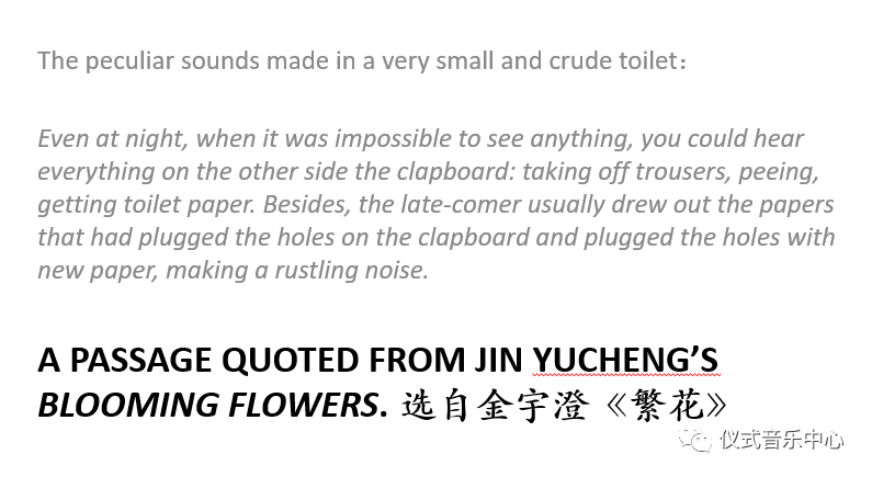 5.In the next passage from Jin Chengyu’sBlooming Flowers,we will hear the peculiar sounds madeina very small and crude toilet: