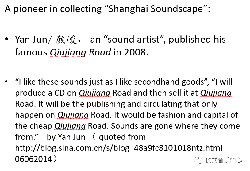 About Shanghai urban soundscape,I’d like to mention, Yan Jun, an “sound artist”, he published his famous Qiujiang Road in 2008. He recycled the sounds from a road in the marginal area of Shanghai, which abounds with shops selling cheap digital products, machine parts and second-hand machines. Interestingly, it was from my daughter, who studied at our conservatory that I got to know and began to pay attention to such a group of people who also work on field recording, but with purposes different from collecting and compiling traditional music, that is, different from ours. With such sound artwork as Qiujiang Road, Yan Jun isdoubtlesslya pioneer in collecting “Shanghai Soundscapes”.