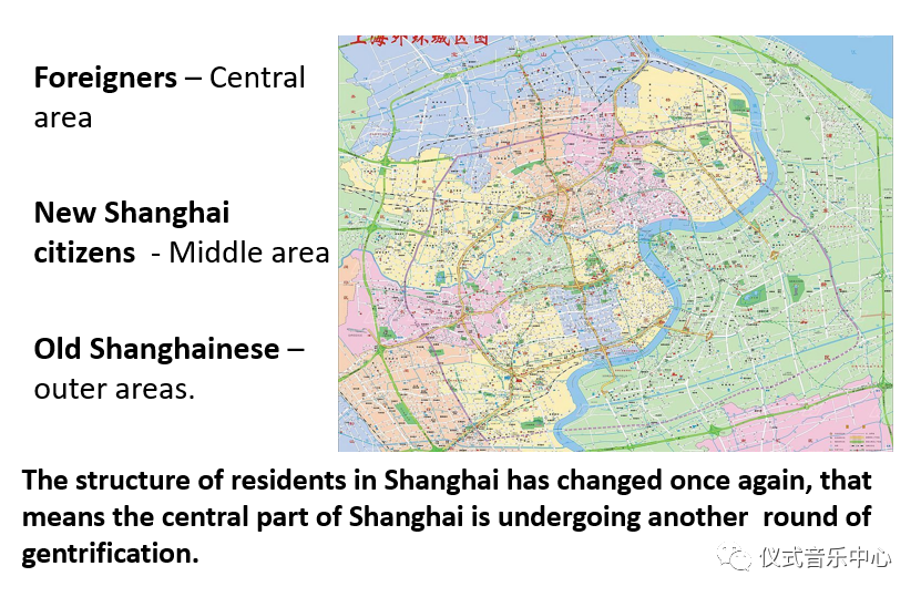 In recent years, the structure of the residents in Shanghai has changed once again. Foreigners, many of whom work in international firms, live in the central area of the city. The outer areas, which used to be countryside, have become new districts, into which the old Shanghainese moved from Shikumen. In the areas between these two parts live the new Shanghai citizens who came from other provinces andgetsettled here. Thus the central part of Shanghai is undergoing another round of gentrification.
