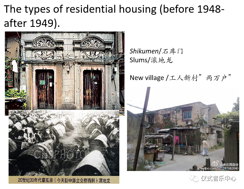 Take the types of residential housingasexample. There were independent villas, townhouses, apartment buildings,Shikumen, shanty towns and slums. After 1949, a new residential community appeared in which two-storey apartment buildings were built for those who used to live in shanty towns and slums and for the newly employed workers. Each building has ten rooms with sharedatoilet andakitchen. Such a community, called a “new village for workers”, could accommodate about twenty thousand households(两万户). All these various residential types represent different living environments and social statuses of the residents.