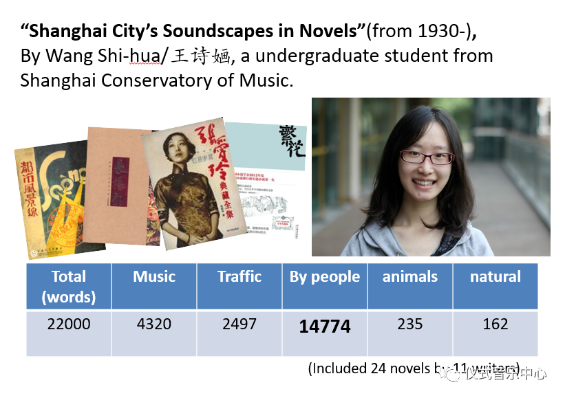 She is our groupmembers,Wang Shihua, a seniorundergraduatesin musicology at Shanghaiconservatoryof Music. She did a research on the description of Shanghai’s soundscape found in the modern realist novels with Shanghai as background and by writers living in this city. The works she chose cover a span from the 1930s to the present, including 24 novels by 11 writers. From these novels, she extracted excerpts depicting sounds, and classified these excerpts and made a statistical study of them. You can see the result is, most of the wordsofsounds made by people from living space.