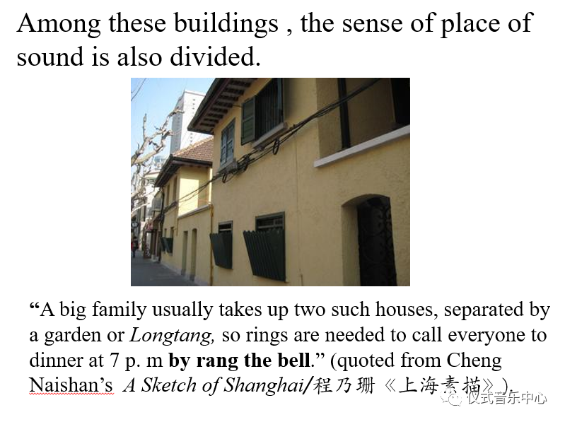 Among these buildings as symbols of social ranks, the sense of place of sound is also divided. For instance, lives in villas often strike us as mysterious, for people outside the private garden or yard cannot see through. As to the townhouses, also known as “new style longtang”, “a big family usually takes up two such houses, separated by a garden or Longtang, so rings are needed to call everyone to dinner.” (quoted from Cheng Naishan’sA Sketch of Shanghai).