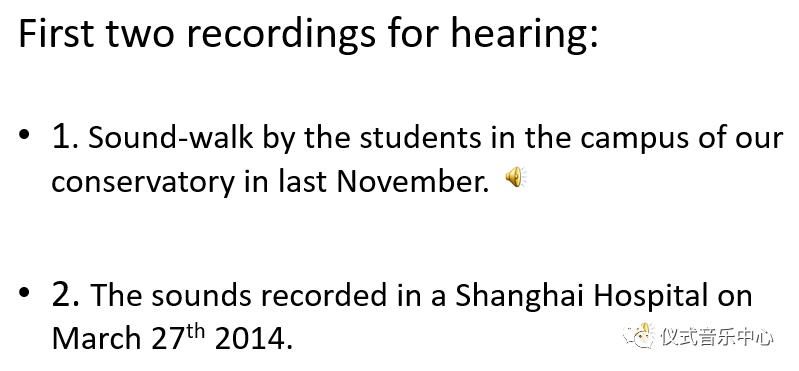 1.The sound is so ordinary that we don’t notice it in our daily lives. In this field recording, our students differentiated sound-marks, keynote and sound signals and became aware that paying full attention to the “acoustic perfume”, which is common in an academic institution, will probably make us neglect the natural sounds around us. That is to say, music, as an artificial and invented soundscape, working like a sound wall, overshadows the “Lo-fi” soundscape made up of such naturalsoundas falling leaves, wind, footsteps, etc.