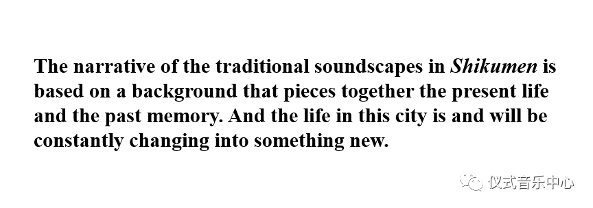 The narrative of the traditional soundscape in Shikumen is based on a background that pieces together the present life and the past memory. And the lifeinthis city is and will be constantly changing into something new.
