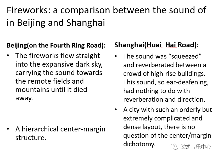 The two kinds of firework sound communicate two different senses of place. The firework sound in Beijing reminds me of the city’s strict layout as well as its traditional administrative management. Specifically, as the capital city with a long history, Beijing has a hierarchical center-margin structure, whose influence can still be seenfromtoday’s organization of residential communities and the names of the streets. The situation in Shanghai is quite different. In a city with such an orderly but extremely complicated and dense layout, there is no questionofthe center/margin dichotomy. All the fireworks fuse with each other in the narrow space of the city, creating a resounding and complex sonic field, in which it is impossible to trace any single sound. Crowded, flourishing, full of possibilities and uncertainty, that is exactly what the Chinese people think of Shanghai.