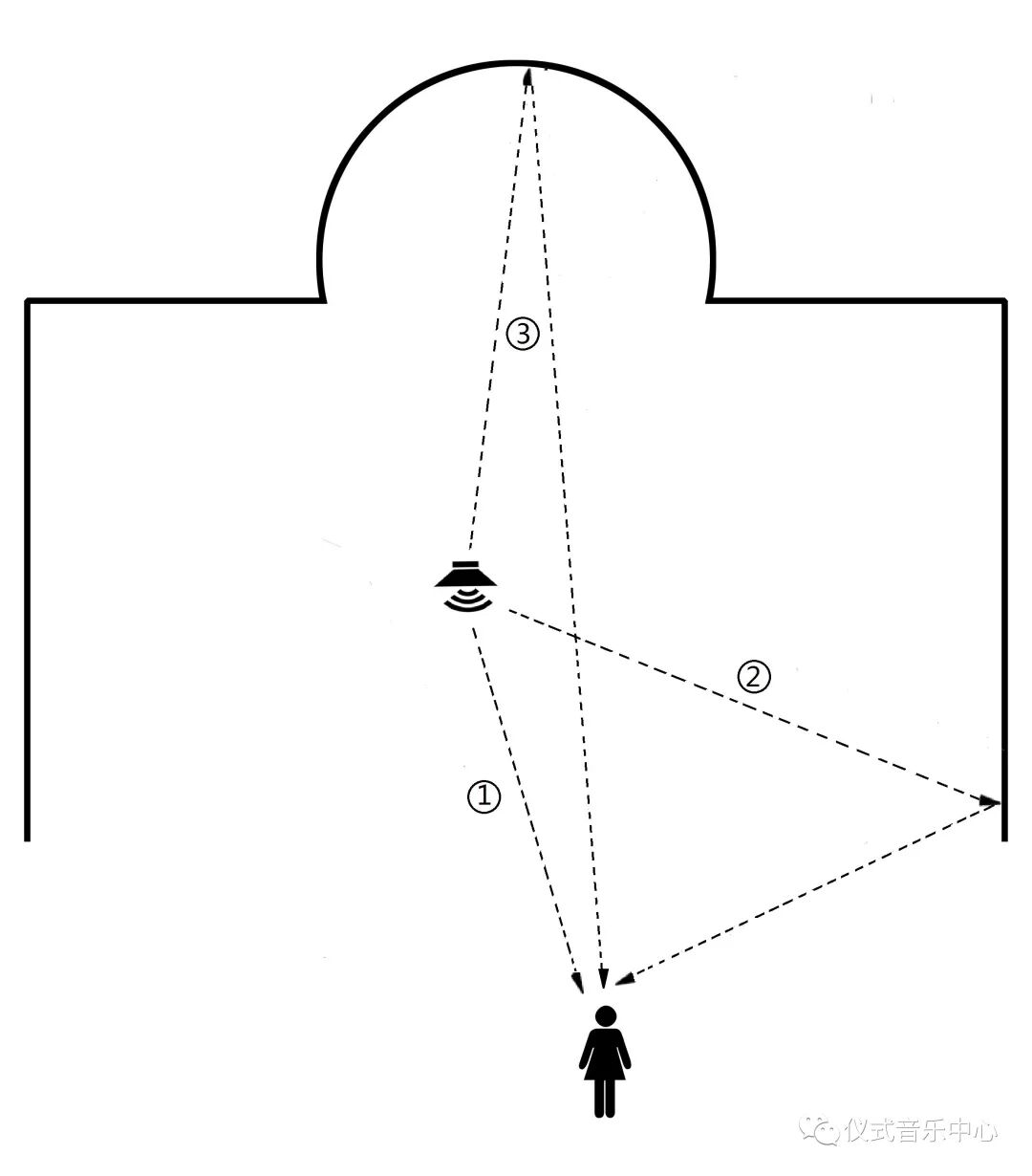 从后台“开字形”窑洞和演员的位置关系看,“开字形”窑洞耦合空腔的共振声加强了声源的直达声,强化了声音方位感,延长了混响时间。对于正殿中的真武大帝而言,传入耳朵的首先是演员或乐队的直达声,其次是戏台隔断、两侧山墙和前台屋顶天花等建筑构件的反射声,最后是经过窑洞弧形表面汇聚声和耦合空腔的共振声。由于直达声、反射声和窑洞耦合空腔共振声的传播距离相差不大,它们到达真武大帝耳朵的时间差小于50ms,所以不会产生回声。较强的直达声率先到达,确定了声音方位感和清晰度;戏台隔断、两侧山墙和前台屋顶天花等建筑构件的反射声随后到达人耳,加强并延长了直达声[13];最后到达的共振声位于声源后部,继续强化了声音方位感,同时也延长了混响时间[14—17](图15)。对于演员而言,歌唱声首先通过骨传导和衍射进入自己的耳朵,其次是戏台隔断、两侧山墙和前台屋顶天花等建筑构件的反射声,最后是后台“开字形”窑洞耦合空腔的共振声。乐队声传入演员耳朵则首先是直射声,其次也是反射声和后台“开字形”窑洞耦合空腔的共振声。反射声和共振声加强了演唱声,增加了演员和乐队之间的协调度,即提高了舞台的支持度,对于演员而言即“戏台唱戏不费力”。