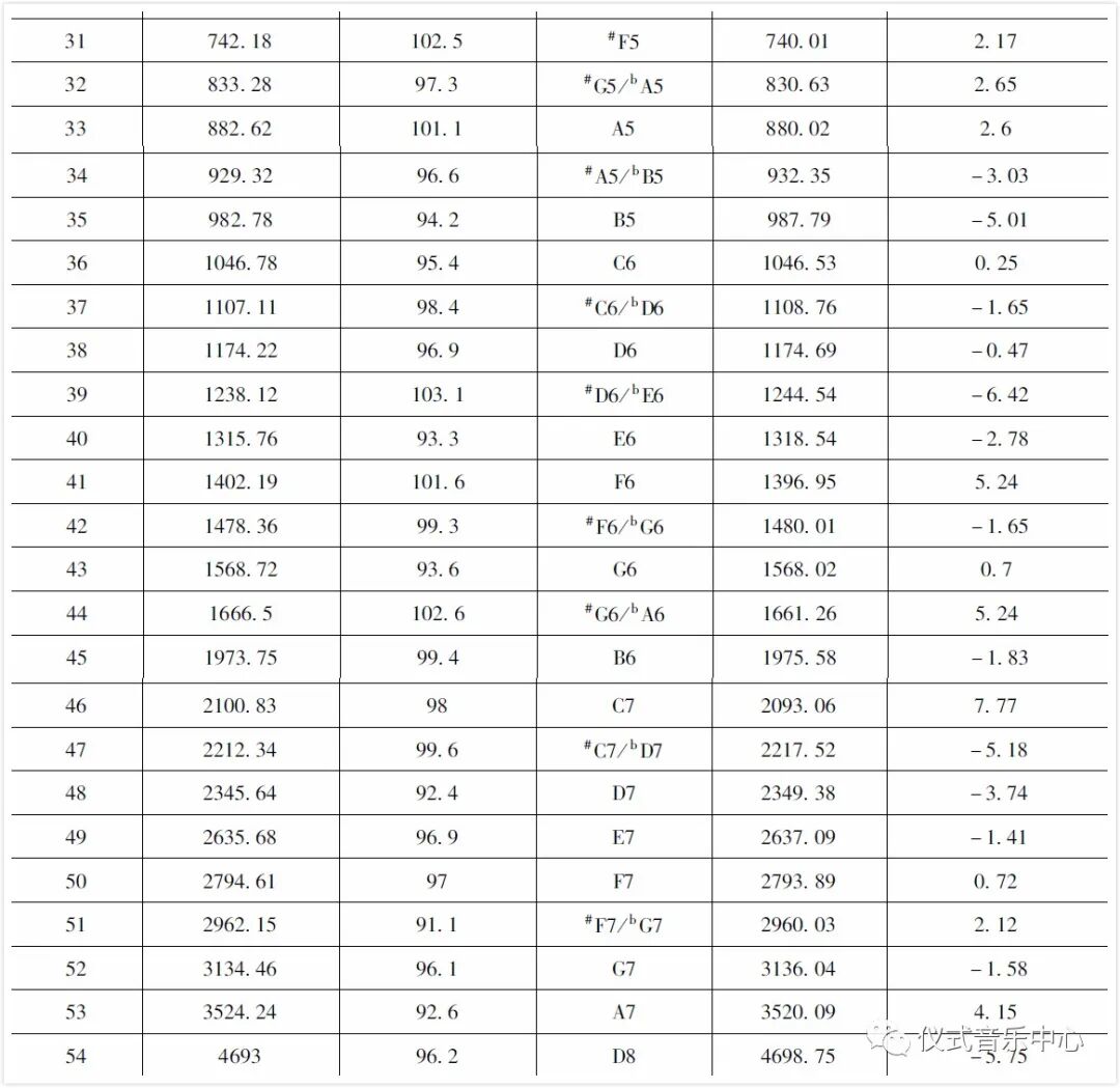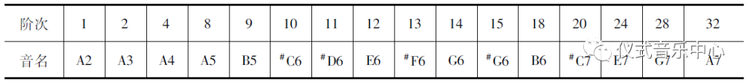 分析所有扫频结果,发现声源设在后台时共有54个与乐音相关的峰值频率⑫(表2);声源设于前台靠近隔断中间一米处时共有57个与乐音相关的峰值频率(表3)。