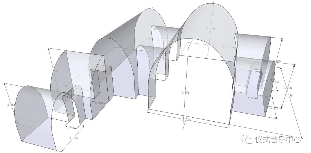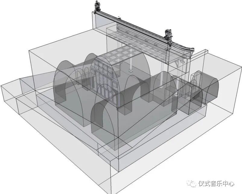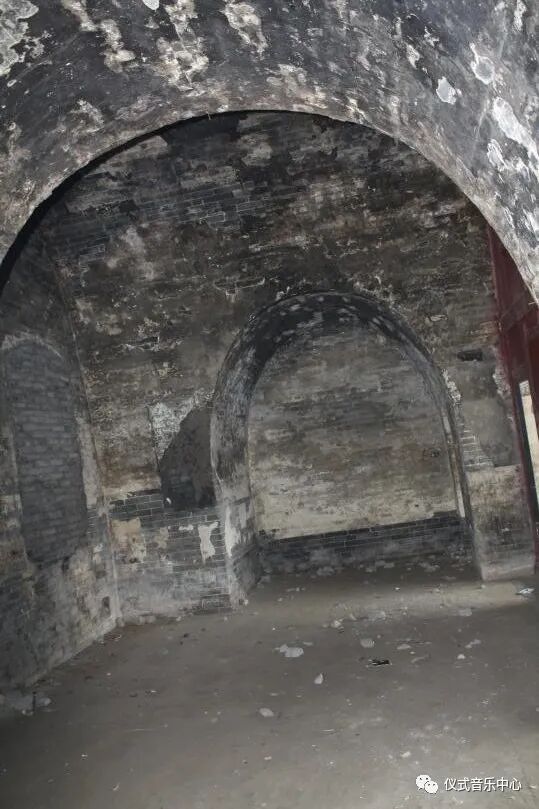 根据数年的考察经验,结合真武庙古戏台的形制结构特征,我们发现后台窑洞不仅是演员换场、化妆和休息之所,还是古戏台声学效应形成的重要建筑构件。按照霍恩博特尔(Erich M. von Hornbostel)和萨克斯(Curt Sachs)对乐器声学结构的分类方法,演员的气息类似马林巴的琴槌,属于激发系统;演员的声带类似马林巴的琴键,属于振动系统;两侧山墙、天花等建筑构件类似马林巴的琴键和共鸣管间组成的的空气传导部分,属于传导系统;窑洞弧形空腔与打击乐器马林巴(Marimba)的共鸣管类似,多孔交叉的窑洞弧形空腔犹如将多共鸣管交错组成的耦合共振空腔,属于共振系统。⑩