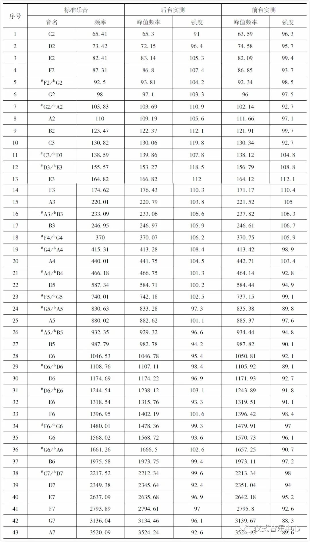 综合分析表2、表3,声源位于前台或后台时相同的共振乐音有43个(表4)。这说明真武庙古戏台50Hz-6500Hz频段的共振乐音共有43个。