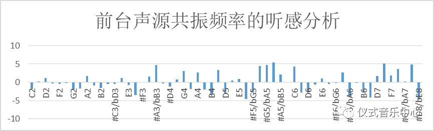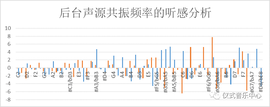 从声源分别在前台和后台时共振乐音强度对比图(图12)可知,当声源分别置于前台和后台时激发的乐音有43个相同,它们分别是:C2、D2、E2、F2、#F2/bG2、G2、#G2/bA2、A2、B2、C3、#C3/bD3、#D3/bE3、E3、F3、A3、#A3/bB3、B3、#F4/bG4、#G4/bA4、A4、#A4/bB4、D5、#F5/bG5、#G5/bA5、A5、#A5/bB5、B5、C6、#C6/bD6、D6、#D6/bE6、E6、F6、#F6/bG6、G6、#G6/bA6、B6、#C7/bD7、D7、E7、F7、G7、A7。声源在后台时激发乐音的共振幅值绝大多数大于前台,增幅最大的乐音是C3,为27.1dB,增幅最小的乐音是D2,为0.7dB。尤其是E2-#D3/bE3、#A4/bB4-#F6/bG6段共振幅值增长较大,仅有乐音C2、E3、F3、A3、B3、G6、D7的共振幅值例外。这说明后台激发效果好于前台,也间接说明充分激发后台窑洞的峰值频率,其共振幅值会升高。