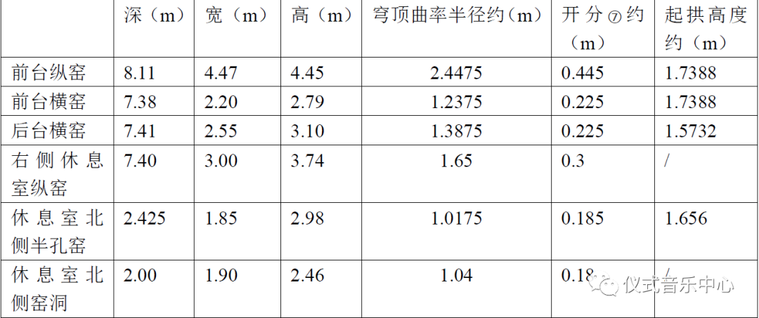 戏台建在庙门之外,与庙门相对,相距约50米。其建筑结构不同于平遥超山庙古戏台,主要由两孔跨度较大、高度较高的纵窑和一孔半跨度较小、高度较低的横窑交错组成,结构呈“开”字形。窑洞的券形为四心圆⑤,内壁涂抹白石灰。台顶为硬山顶,正脊两端设龙形吞脊兽两只,宽0.67米,高1米;垂脊设龙形垂兽两只。条石台边的台基高1.24米,长11.58米,宽12.6米。戏台的前台和后台共处于一孔纵窑,前台为窑洞加前廊式,面阔三间,明间移柱造(图2)。后台窑洞为双孔交叉“枕头窑”⑥的变体(图2)。戏台总面积为107.3069平方米,其中前台表面积为44.49平方米,前台之外窑洞表面积为62.8169平方米。古戏台通面阔8.57米,其中明间4.45米;通进深10.67米,其中前台6.465米,廊檐2.55米。前廊设直径0.23米檐柱四根,鼓镜柱础高0.27米,直径0.3米。前台纵窑阔(即明间距离)4.45米,深3.915米;台顶设天花,距离台面3.892米,天花完好。前台和后台由木隔断分开,木隔断设出将入相门。前台两侧均辟一东西向小窑洞(即前台横窑,阔2.25米,深7.38米,高2.812米),后台设东西向砖窑一孔(即后台横窑,阔2.55米,深7.41米,高约3.1米),与前台垂直交叉。戏台东侧还设有一孔砖券窑洞(即东侧休息室纵窑,阔3米,深7.4米,高3.737米),为演员的休息室,前台东侧小窑洞与之相连,后台东西向窑洞与之直通。前台西侧小窑洞的北侧辟砖券小门(阔0.67米,深0.87米,高1.835米)可通后台横窑。休息室北侧另青砖并列券筑小窑洞一孔半,半孔窑洞(即休息室北侧半孔窑,宽1.85米,深2.425米,高2.979米)斜靠在休息室外墙上;另一孔小窑洞(即半孔窑北侧窑洞,宽1.9米,深2米,高2.9米)与之北侧相连。这一孔半窑洞为厨房,与休息室相通,小窑洞辟门通外,门阔0.962米,高1.974米(见表1,图4—6)。