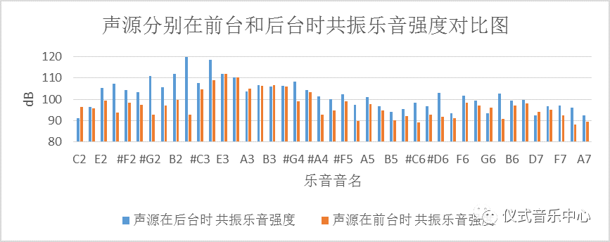 图12 声源分别在前台和后台时共振乐音强度对比图