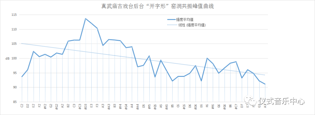 取前台实测峰值和后台实测峰值的均值,与43个乐音对应,可得其趋势线(图13)。图中横坐标为各乐音音名,纵坐标为各乐音的声压级。实线为声强包络线,虚线为趋势线。由共振峰值的包络线可知在频段B2音123.47Hz至#F4音370Hz,为古戏台后台窑洞共振峰值中声压级最高的频段,明显高于频段#F4音370Hz至F6音1396.95Hz。由趋势线可知,其共振峰值整体强度呈下降趋势。