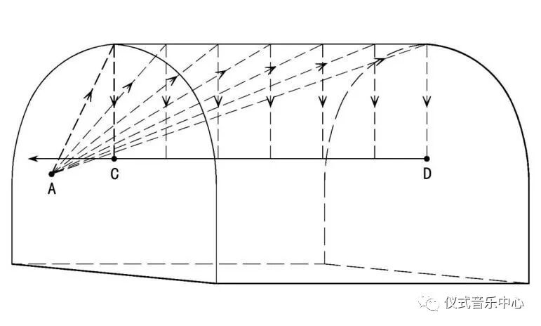 从几何形状看,窑洞内部形状利于扩声、传声。与方形相比,有一定弧形内壁的窑洞平行面较少,不易形成驻波,利于声音传播[12]。不仅如此,弧形表面还可对声波形成汇聚,汇聚后的声波经反射后向外传播(图14)。此时声汇聚处的声压级较高。