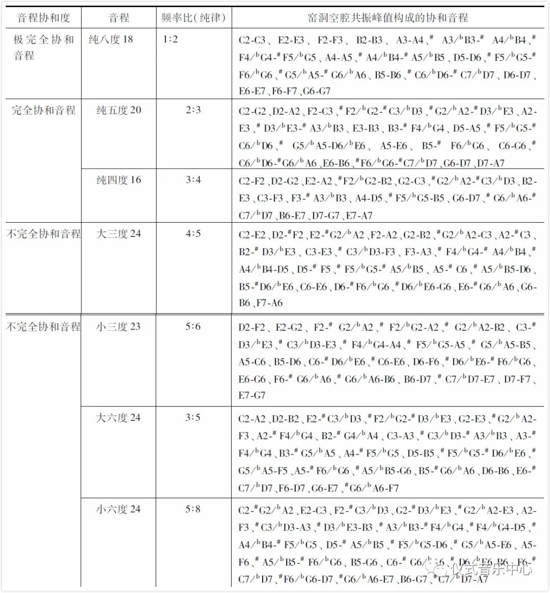 被“开字形”窑洞空腔放大的43个乐音,可以构成许多极完全协和音程、完全协和音程和不完全协和音程⑭。现将一个八度内可构成的协和音程列举如下(见表5)。