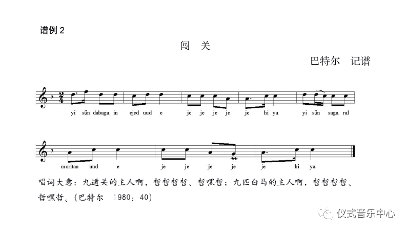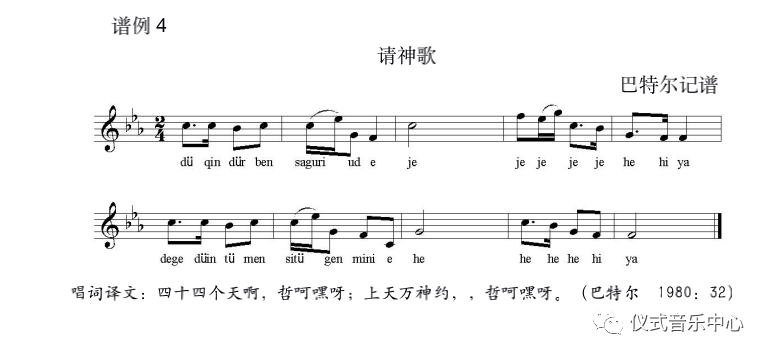 “关”,“dabahu”为“闯”、“过”),意为闯关仪式。功能仪式是指为了解决人们生活中的某一实际问题而进行的仪式,有治病仪式、驱鬼仪式以及求雨仪式、祭天仪式、祭敖包仪式等。每一种仪式都有自己特有的仪式目的和仪式主题,但基本结构和规程却大同小异。以闯关仪式和治病仪式为例,闯关仪式是萨满师傅为新入教的徒弟举行的仪式。仪式上师傅请来自己的守护神附于身上,借助其神力来保护徒弟闯“关”,以证明新教徒已经具备了附体的能力和能够作法的能力。治病仪式是为患病者而进行的,以治病为目的的仪式。萨满认为,人患疾病是由于病魔作怪,常人的力量无法驱除。因此,需要把神灵请来附于身上,借助于神灵的力量来驱除病根。也就是说,两种仪式都要通过附体来完成。萨满神歌是在附体之前演唱的,是萨满与神灵沟通的特定符号。它包括各种祈祷歌(因神灵不同而不同)、迎神歌、送神歌等。在不同的仪式当中,虽然有多有少、有增有减,但基本内容和基本形式保持固有的模式特征。也就是说,萨满仪式音乐有一种特定的模式。这一模式可以稍加改变后,便可用于不同目的和不同功能的仪式当中。